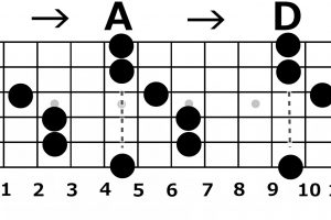 ちなみにこの図でいうと、最初に5弦の3フレット、次に5弦の5フレット、4弦の2フレット、4弦の3フレットの順番に押さえるということになっています。